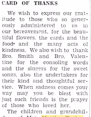 In 1920, the family was living in Wood County, but closer to Golden, near what is now known as Calvary Community---more likely called Bellefont at the time. Everette had moved to Houston, where he was working as a mechanic. The rest of the children still lived with Martha and Stephen. Her mother, who had been widowed in 1913, was also staying with them. I have been told that she suffered a stroke sometime in those years. She could not even speak. Martha nursed her back to health, and she was able to regain many of her abilities---including, I believe, speaking. In the early 1920s, Steve was diagnosed with inflammatory heart and kidney conditions. A few years later, he developed prostate cancer. In June of 1926, he went to Dallas where he had an operation, but he died three days later. Following Steve’s death, Martha and her daughters, Mary, Sarah, and Pauline, moved to Grand Prairie, Texas, where they lived as boarders. I’m not sure why they were there, but C.B. Hill (Gertie’s son) once told me that she had stayed with his family some after he was born, in 1932. None-the-less, Martha moved back to the Mineola, Texas, area in 1931. She remarried a J.H. Titsworth in the New Hope community, in the early months of that year. I’m not sure how long their marriage lasted, as J.H. (his name might have been John) appears to have died by 1940. At that time, Martha and Pauline were living in Mineola. In the years following, Martha developed pancreatic cancer. She died on October 6th, in 1946, at Mother Frances Hospital in Tyler, Texas. She was 74 years old. She is buried in Concord Cemetery, between Quitman and Hainesville, by Stephen, many of her children, parents and siblings.